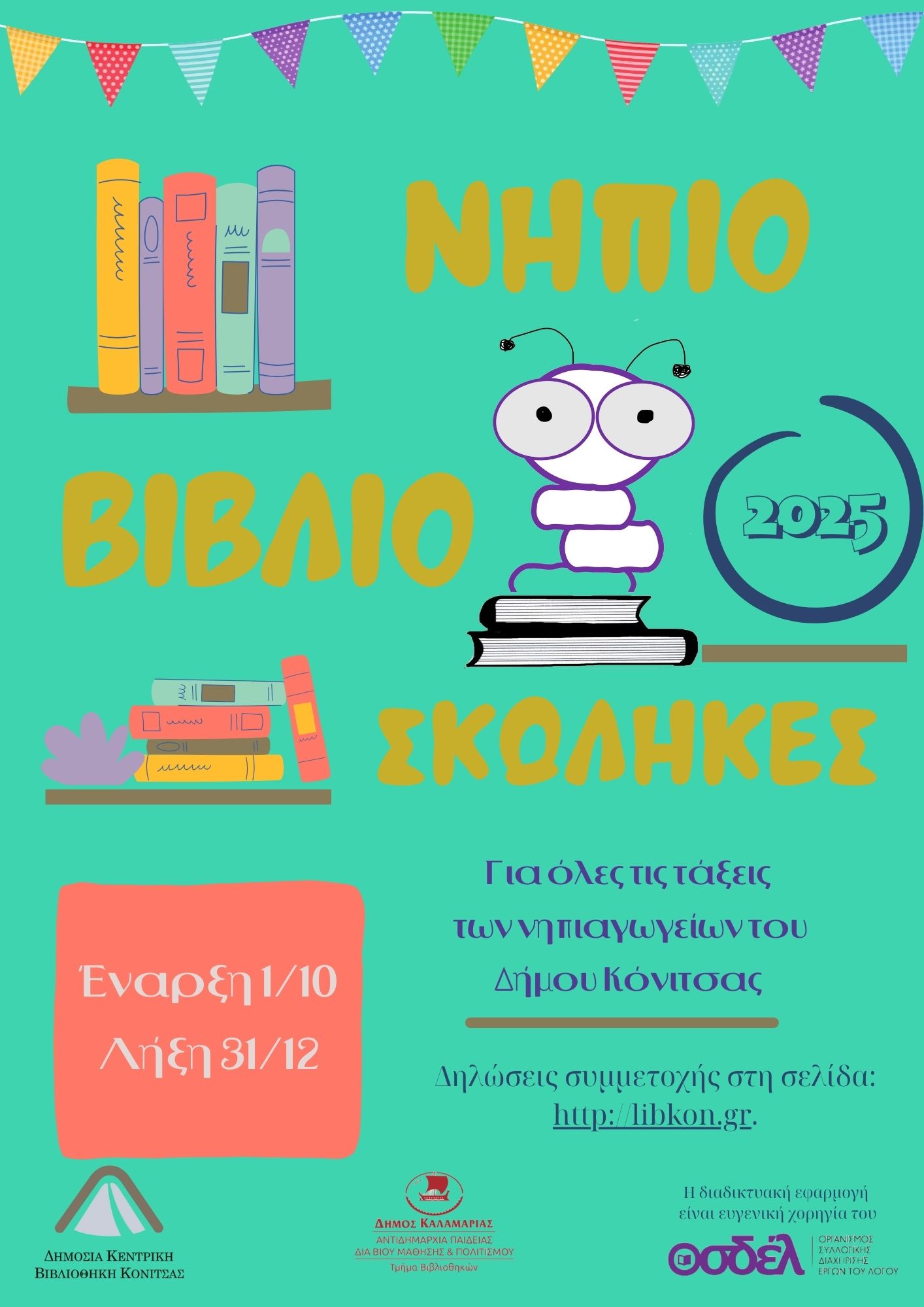 Η Δημόσια Κεντρική Βιβλιοθήκη Κόνιτσας σας προσκαλεί στο Πρόγραμμα Φιλαναγνωσίας «ΝΗΠΙΟΒΙΒΛΙΟΣΚΩΛΗΚΕΣ» που διοργανώνεται για όλα τα Νηπιαγωγεία των Δήμων Κόνιτσας και Πωγωνίου.